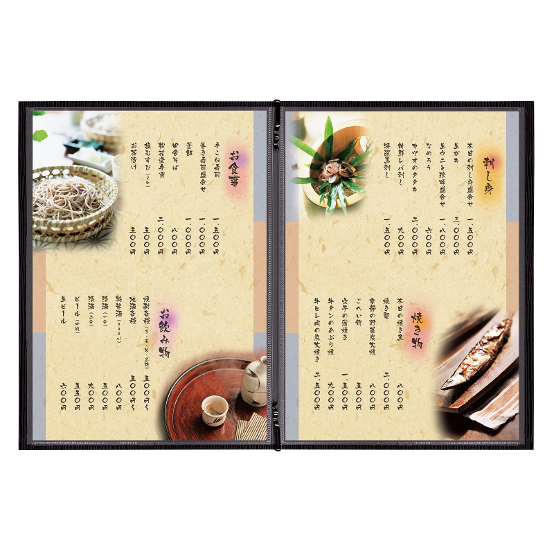 A4サイズ・4ページ ※別売りの専用中ビニールを追加することで最大4枚(16ページ)まで増やすことが可能です。 ※中ビニールは、各メニューブックに適合した専用の中ビニールをご使用下さい。メーカーが異なるメニューブックと中ビニールを組み合わせた場合、サイズや質感が合わない場合がございますのでご注意下さい。 ※各メニューブックには、追加が可能な専用中ビニールの上限枚数がございます(メーカー推奨枚数)。上限枚数を超えての追加はお止め下さい。 |